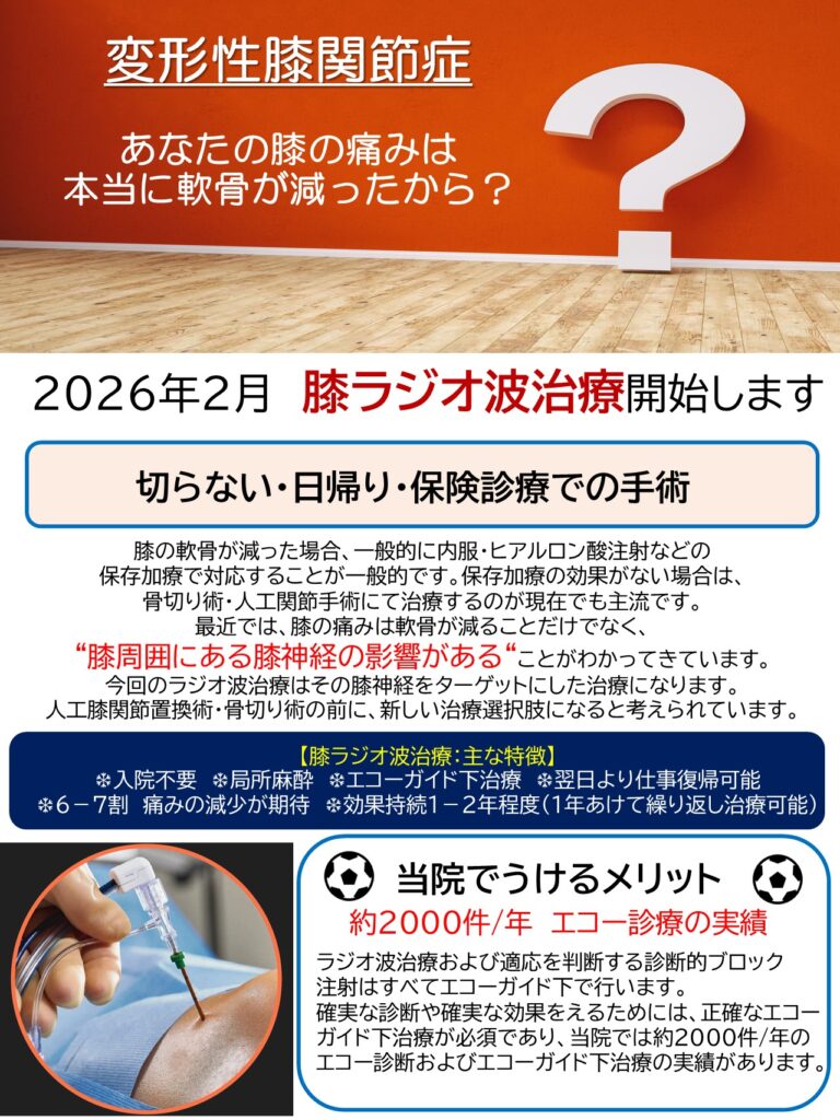 ホーム お知らせ一覧 お知らせ 膝ラジオ波治療(保険診療) 開始します